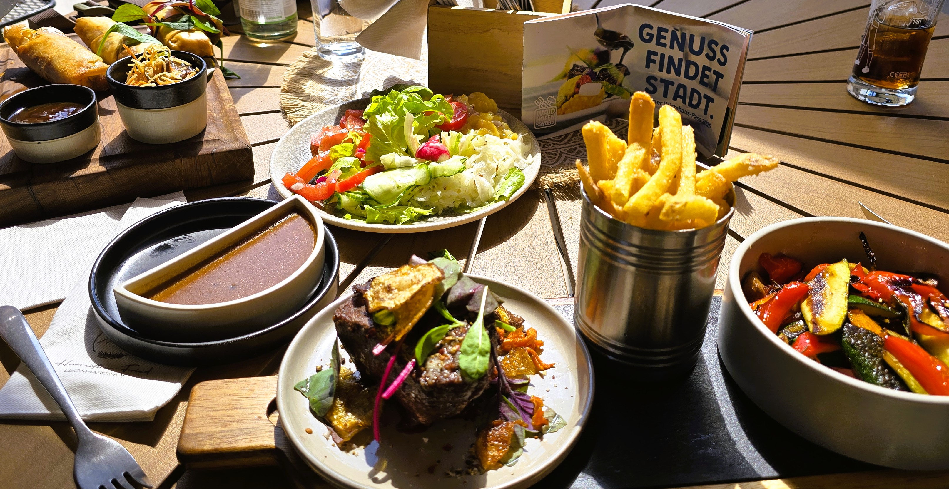 Um das „Wasser im Mundzusammenrinnen“ zu lassen, hier 2 Bilder eines besonders aufwendigen Genusses.(Steak mit Beilage und Gemüserollen) Frage daher: wo gibt es diese besonderen Schmankerl, für die man den Wirtshauspass (Genuss findet Stadt) einsetzen kann?